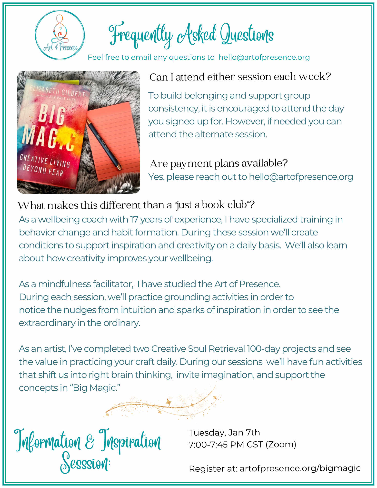 Join us for an Inspiration and Information Session on January 7th (more details below) or email hello@artofpresence.org
